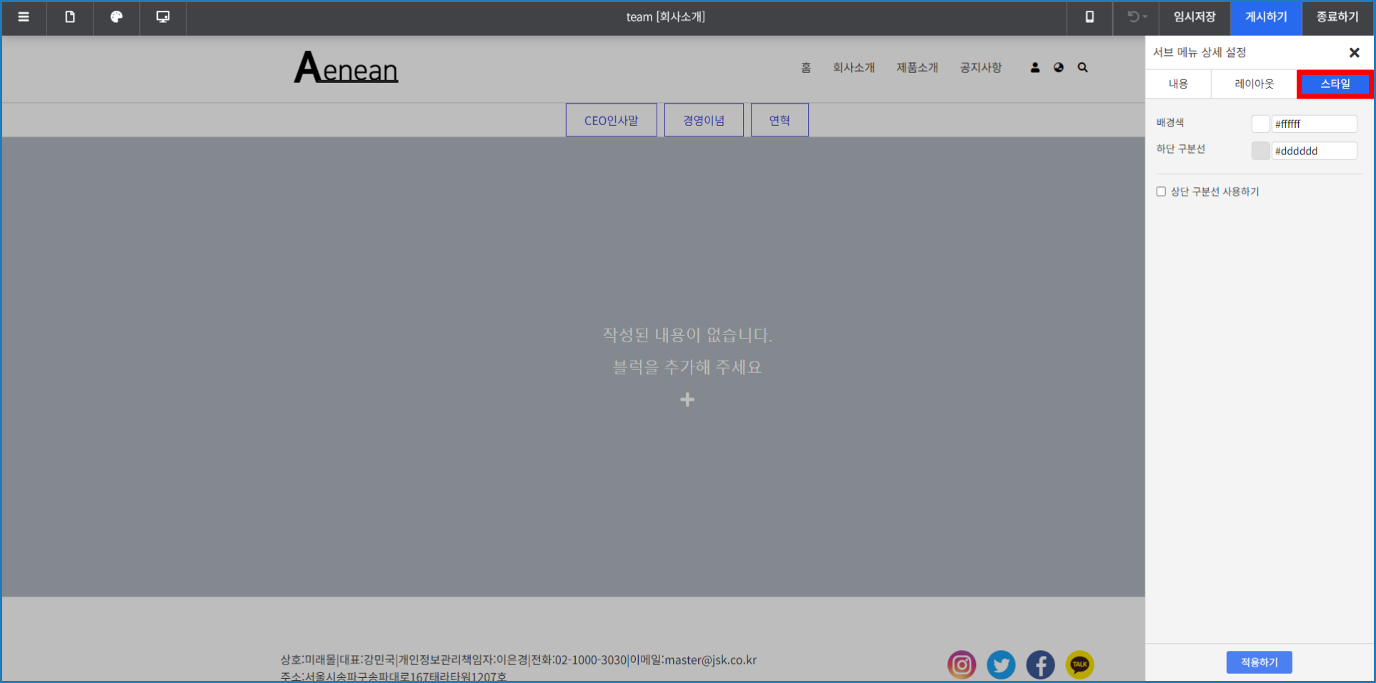 | 배경색 | 서브메뉴 영역의 배경색을 설정합니다. |