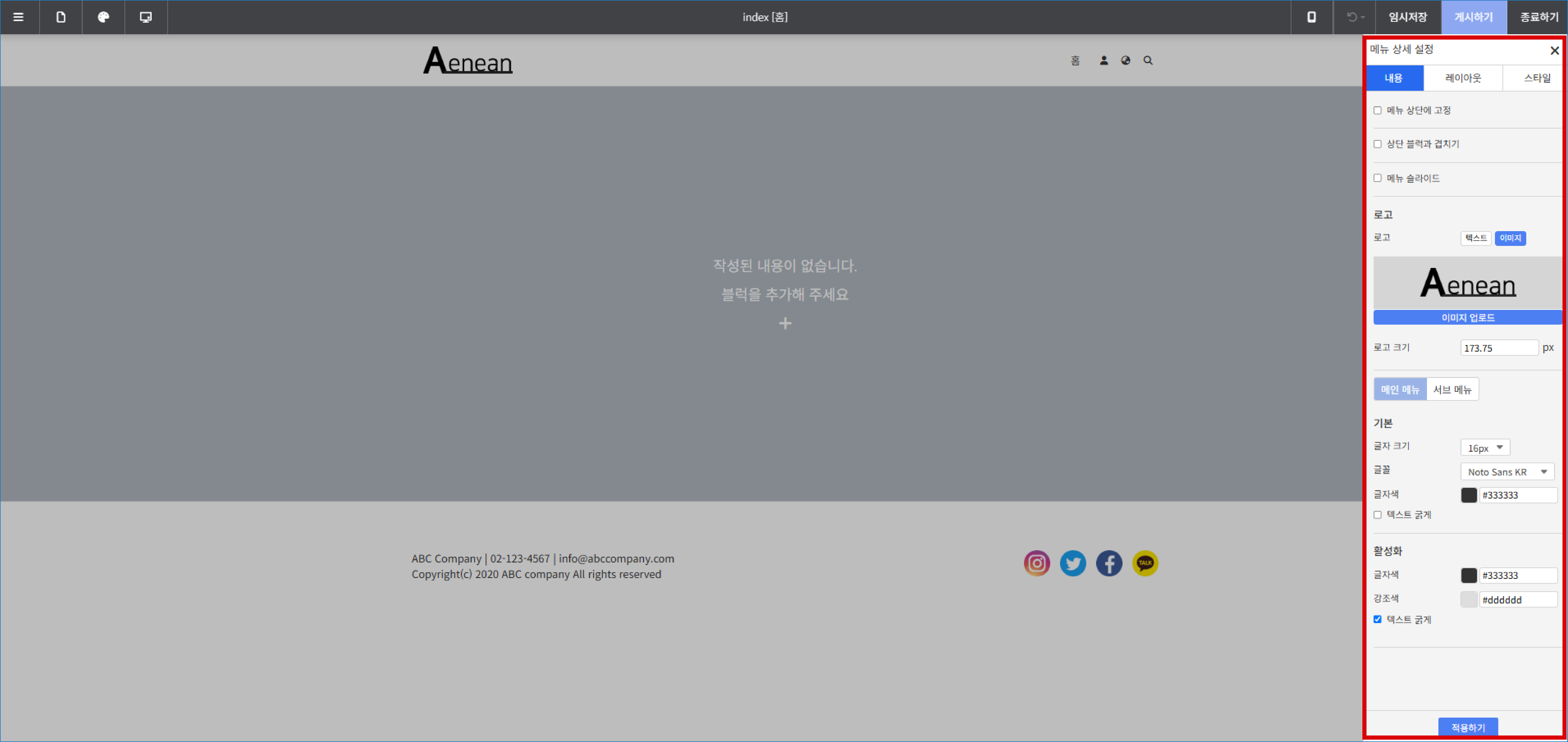 메뉴 상세 설정 기능을 통해 메뉴의 로고, 폰트, 메뉴 고정 및 레이아웃, 스타일 등을 변경할 수 있습니다.