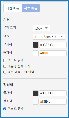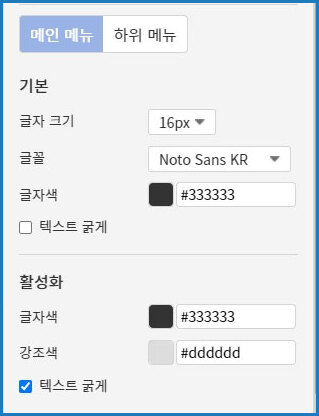 메뉴의 글자 디자인을 메인 메뉴와 하위 메뉴에 따라 설정해줄 수 있습니다.