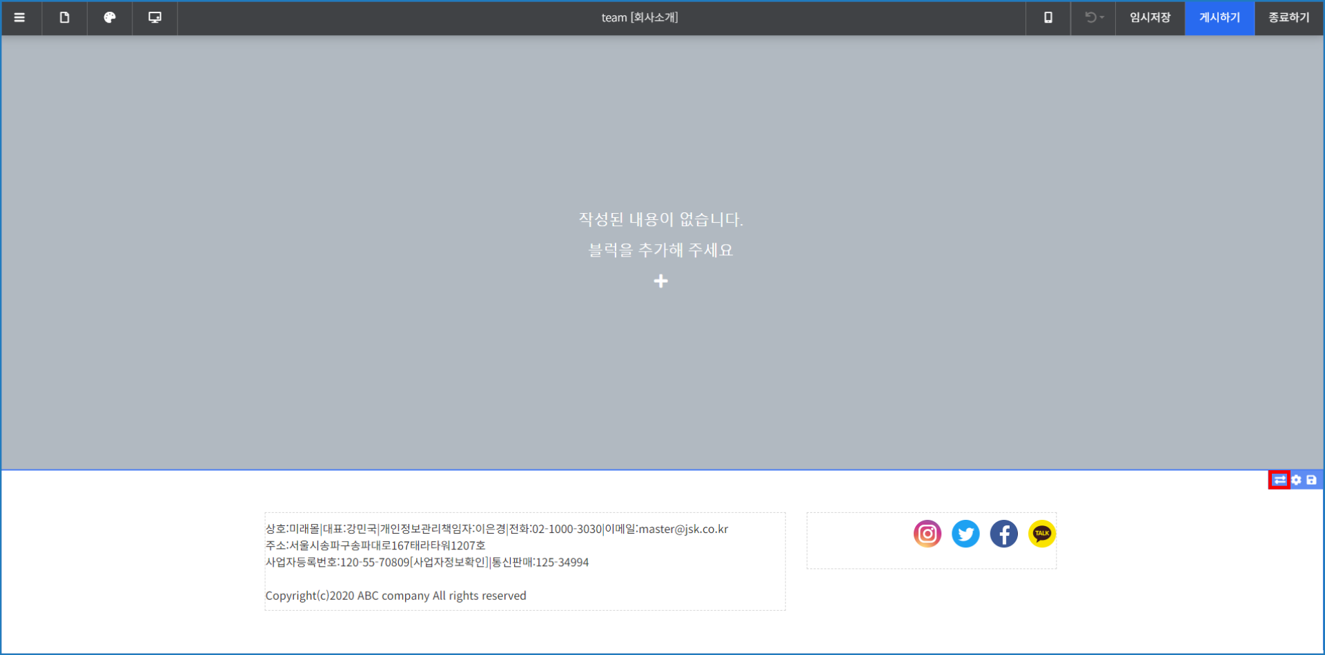 닷홈빌더에서는 몇가지 푸터 디자인을 제공하고 있으며, 디자인 편집화면에서 변경이 가능합니다.