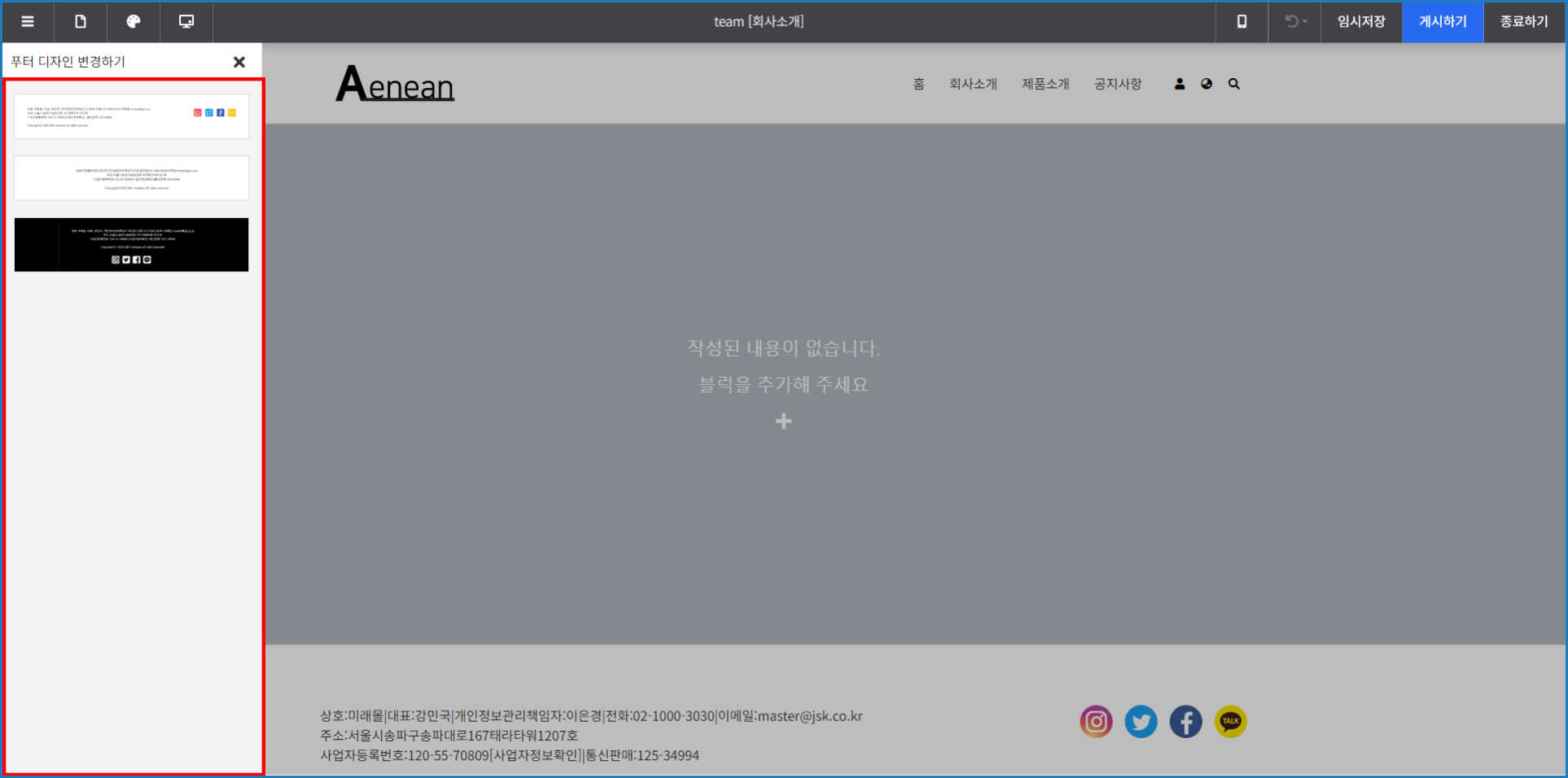 원하는 디자인을 클릭하면 해당 디자인으로 푸터가 변경됩니다.