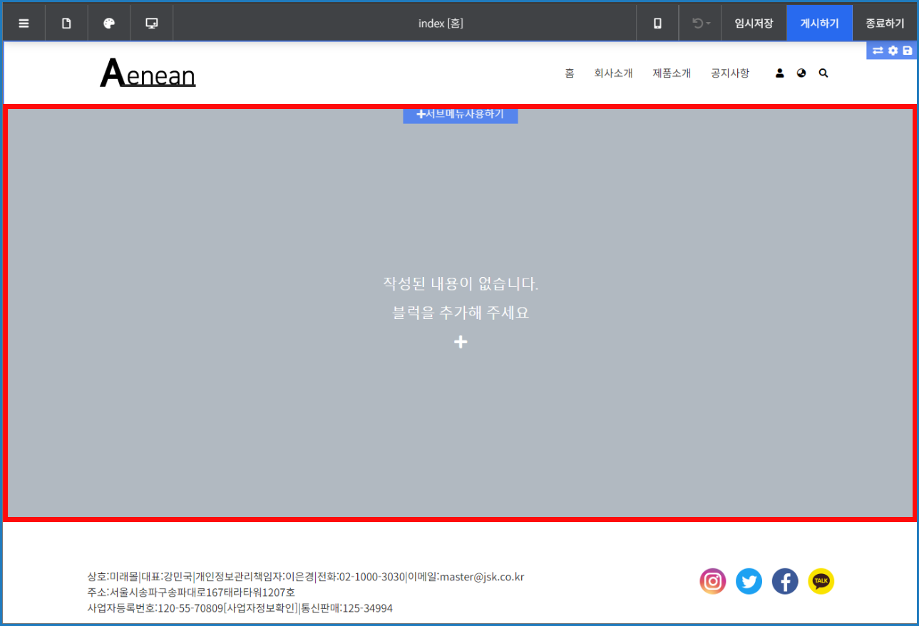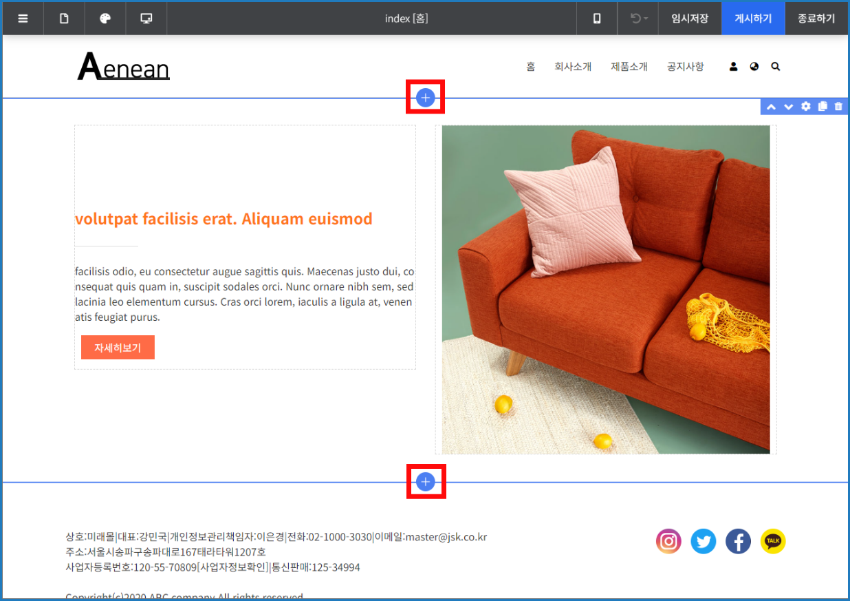 닷홈빌더 디자인 편집 화면에서 [+] 버튼을 이용해서 블럭을 추가할 수 있습니다.