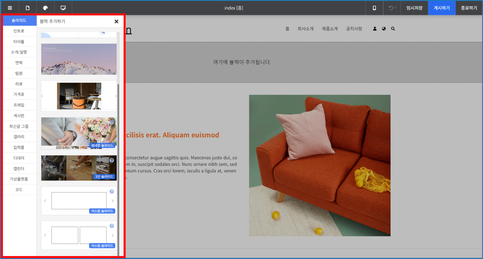 블럭 선택창에서 원하는 블럭을 클릭하시면 블럭이 추가됩니다.