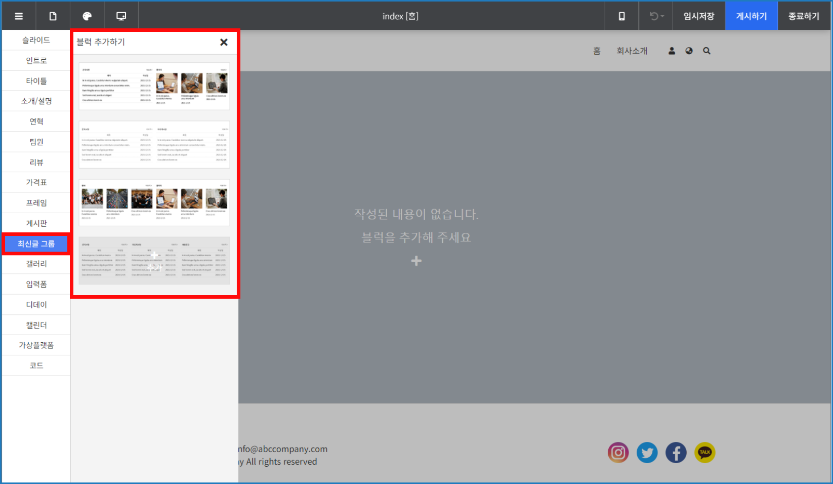 블럭 추가 창의 '최신글 그룹' 탭을 눌러 최신글 그룹 블럭을 추가할 수 있습니다.