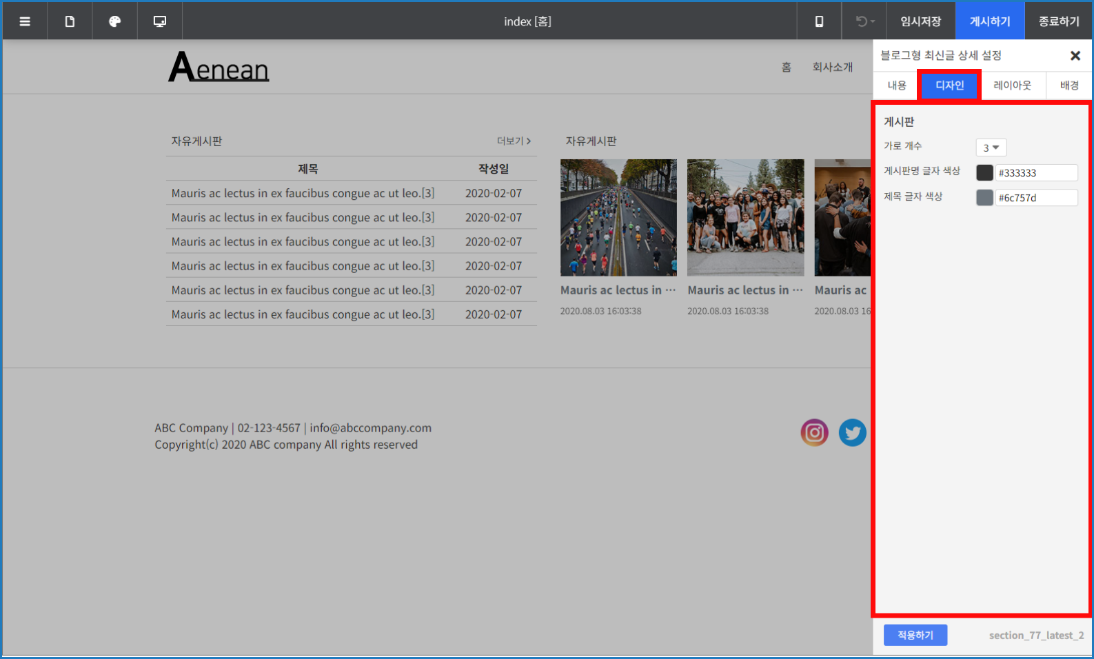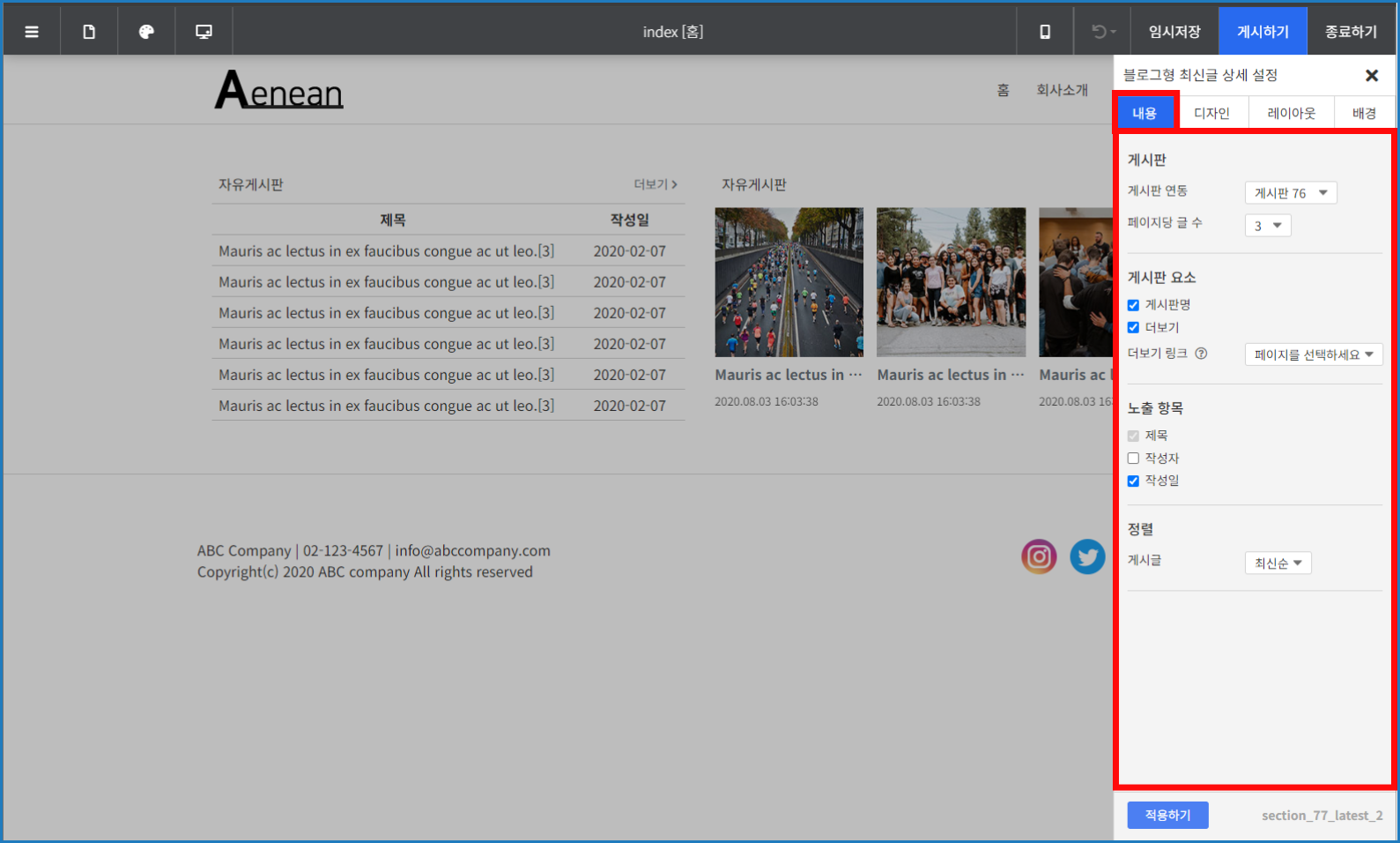 최신글의 상세 설정창은 내용, 디자인, 레이아웃, 배경 네 개의 탭메뉴로 구성되어 있습니다.