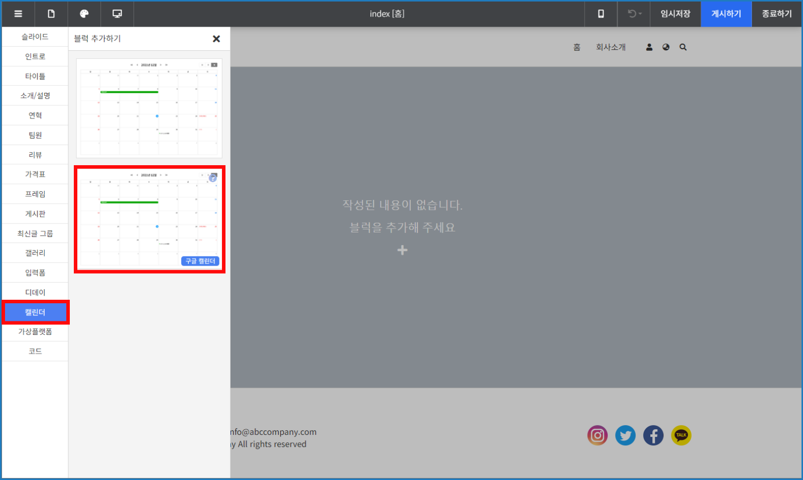 두 번째에 있는 구글 캘린더 블럭을 추가해 주세요.