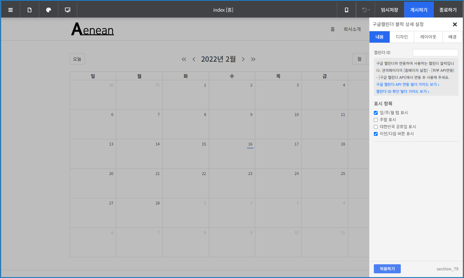 [구글 캘린더 블럭 상세설정 - 레이아웃 설정 화면]