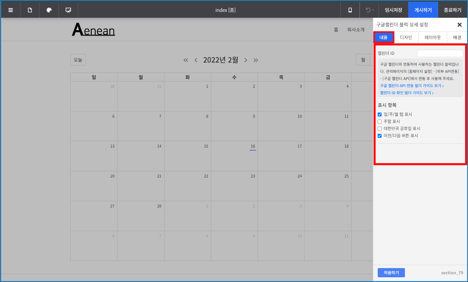구글 캘린더 블록의 상세 설정 창은 ‘내용’, ‘디자인’, ‘레이아웃’, ‘배경’ 네 가지 탭으로 구성되어 있습니다.