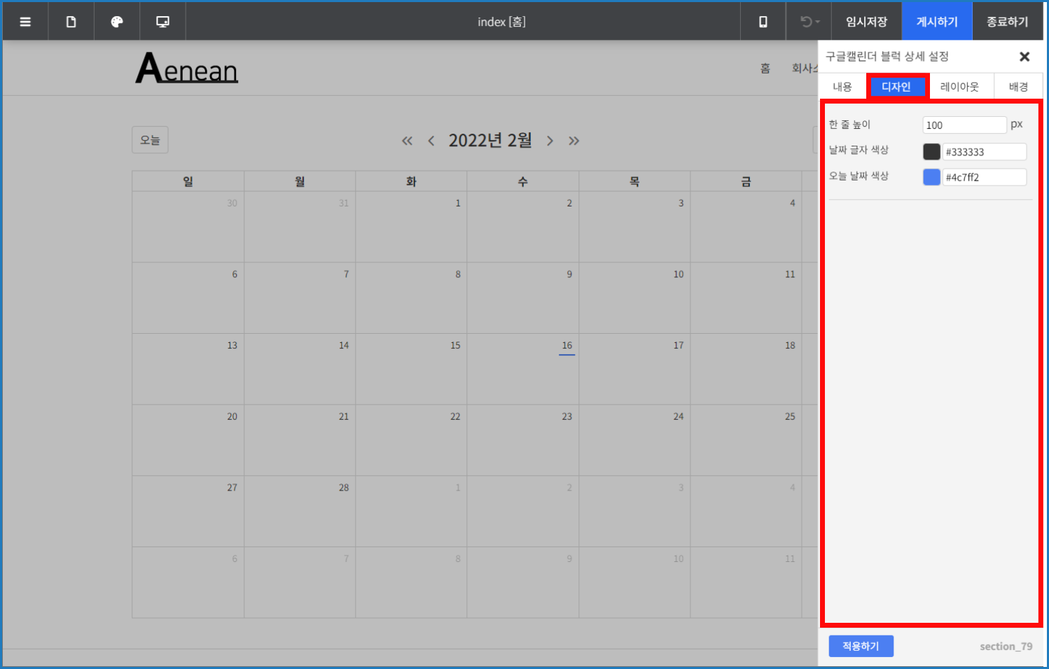 [구글 캘린더 블럭 상세설정 - 디자인 설정 화면]