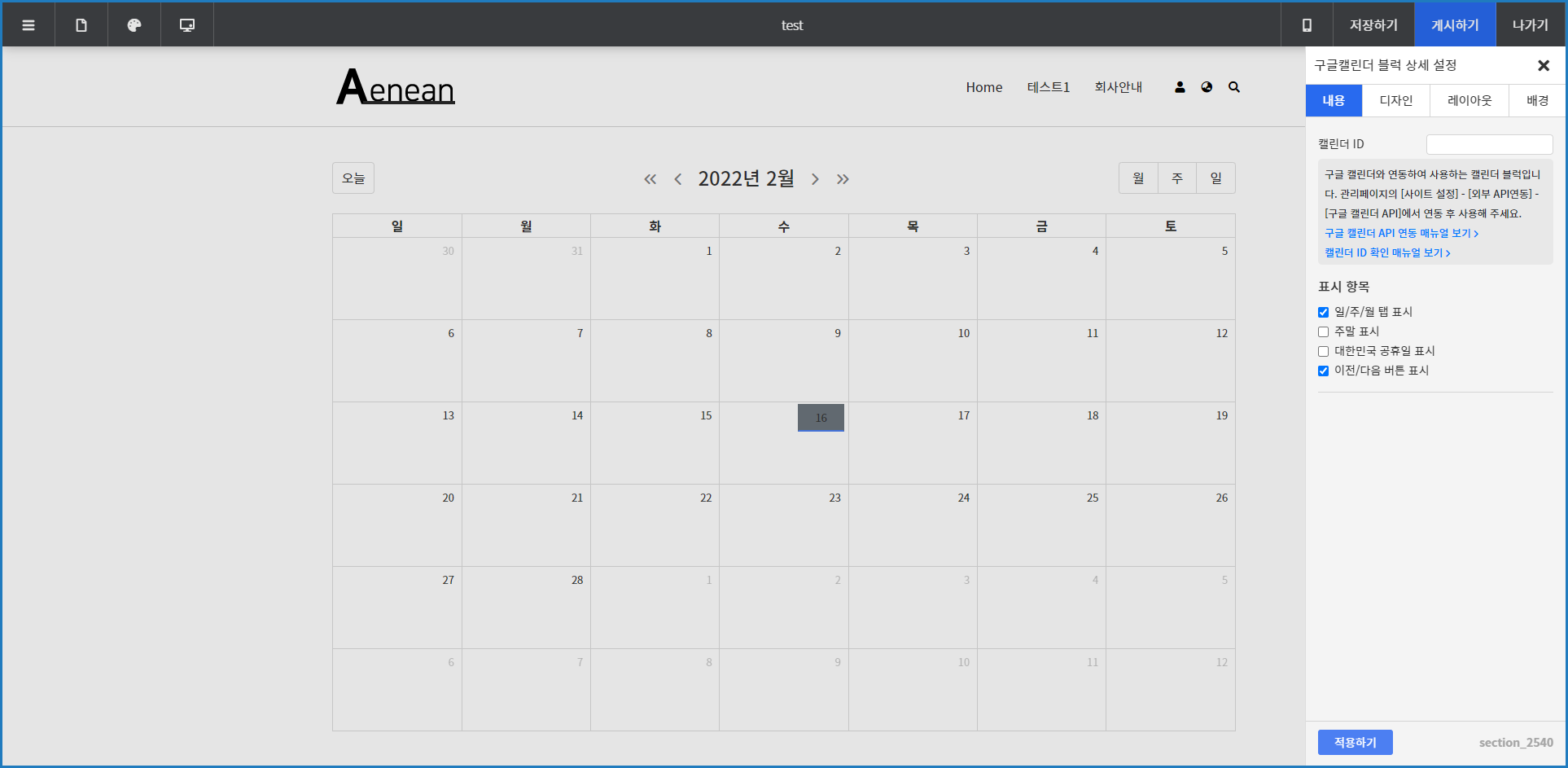 구글 캘린더 블럭의 일정 등록 및 관리는 구글 캘린더 사이트에서 관리할 수 있습니다.