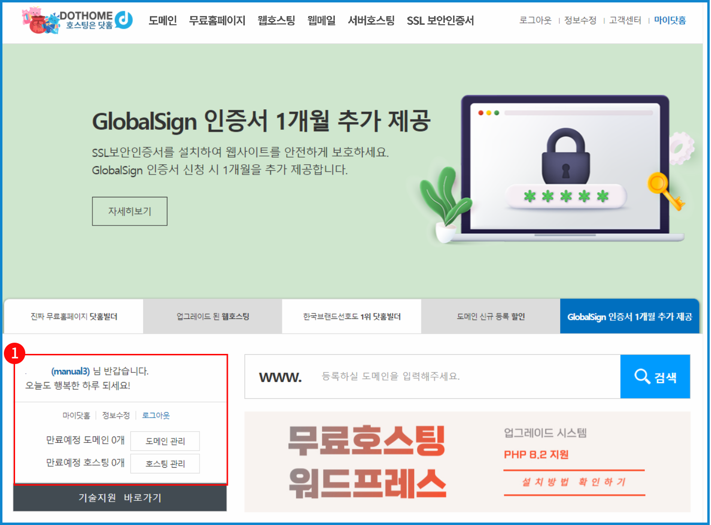 닷홈 메인 페이지에서 ①좌측 아이디 및 비밀번호 입력 창에 회원가입할 때 등록했던 아이디와 비밀번호를 입력해 준 뒤,