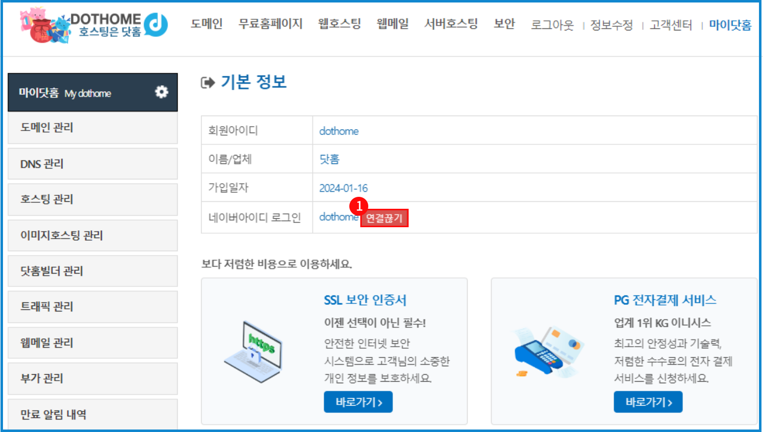 닷홈 홈페이지에 로그인하신 뒤 우측 상단의 ①[마이닷홈] 버튼을 눌러서 마이닷홈으로 접속해 줍니다.
