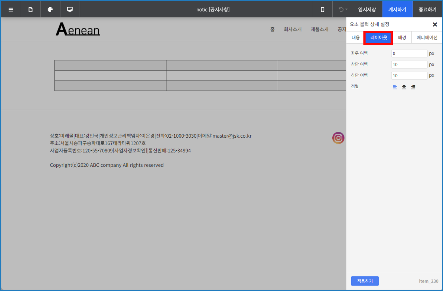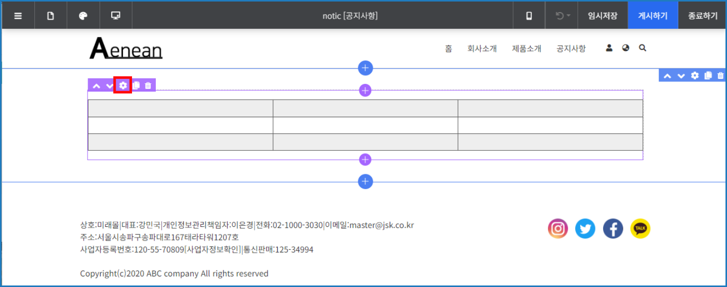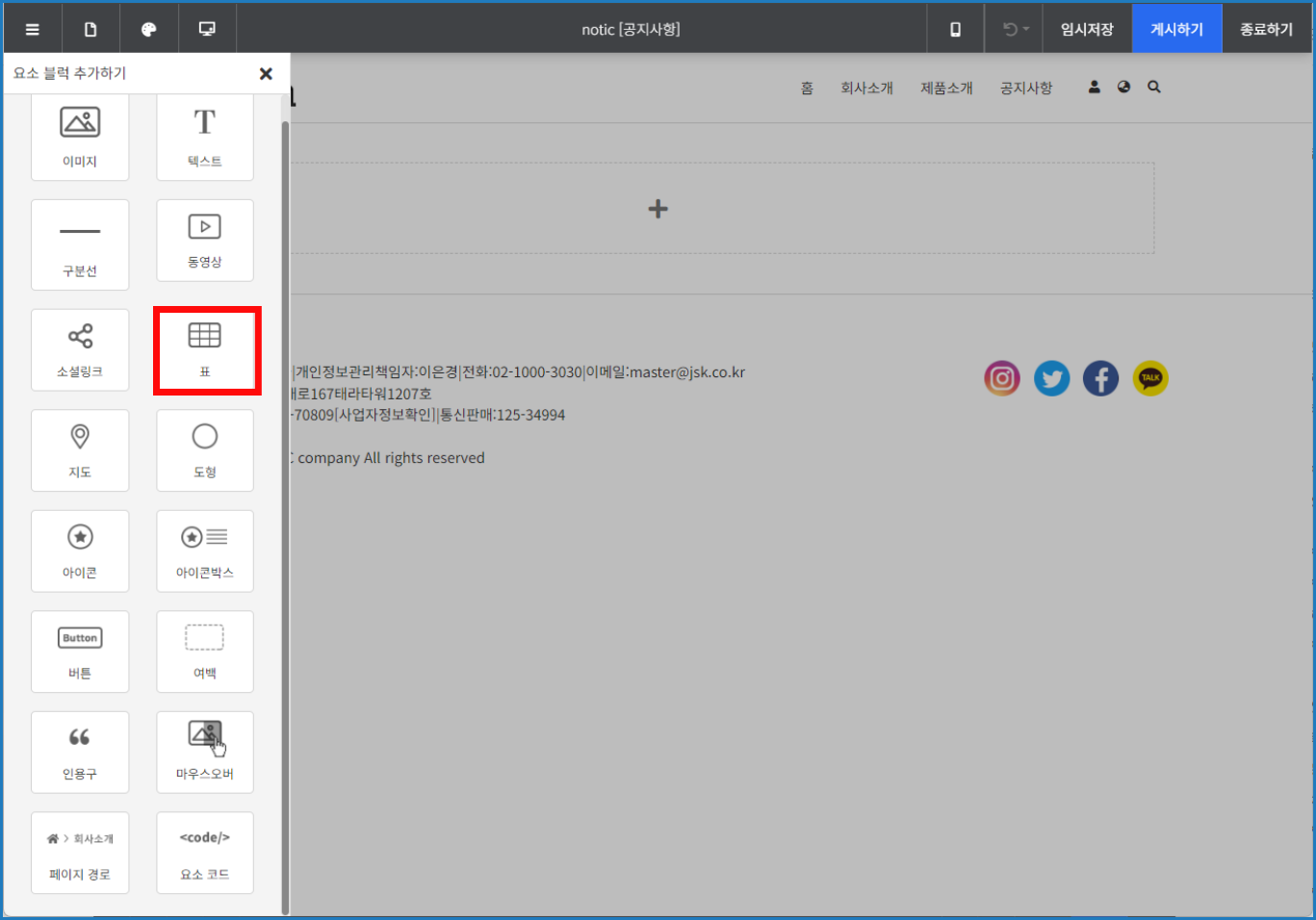 [요소블럭 추가] - [표] 버튼으로 추가가 가능합니다.