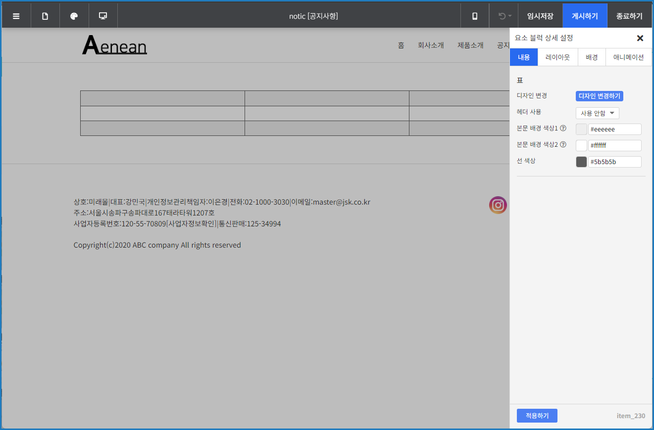 표 블럭의 상세 설정창은 내용, 레이아웃, 배경, 애니메이션 네 개의 탭메뉴로 구성되어 있습니다.