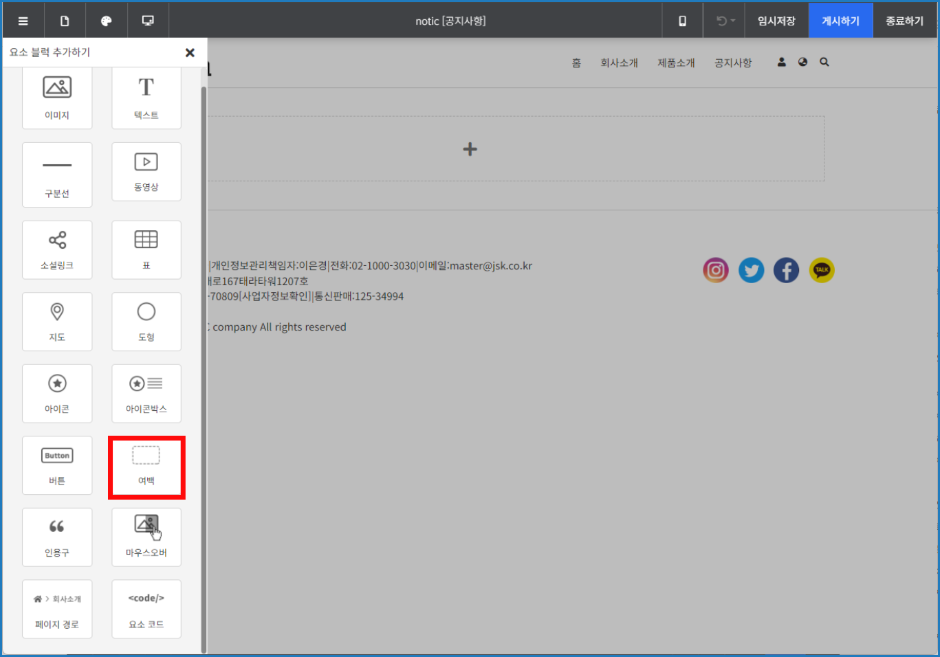 [요소블럭 추가] - [여백] 버튼으로 추가가 가능합니다.