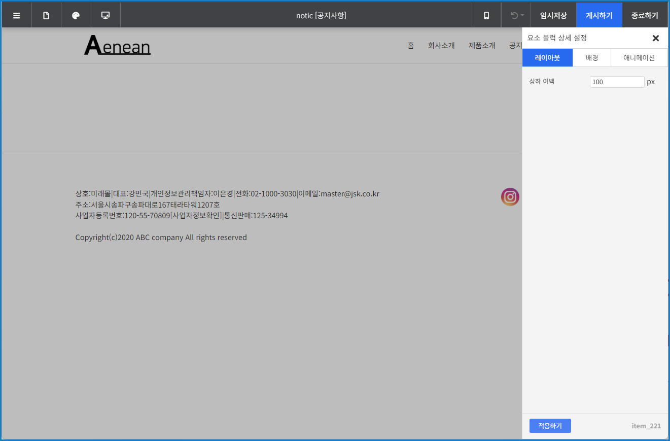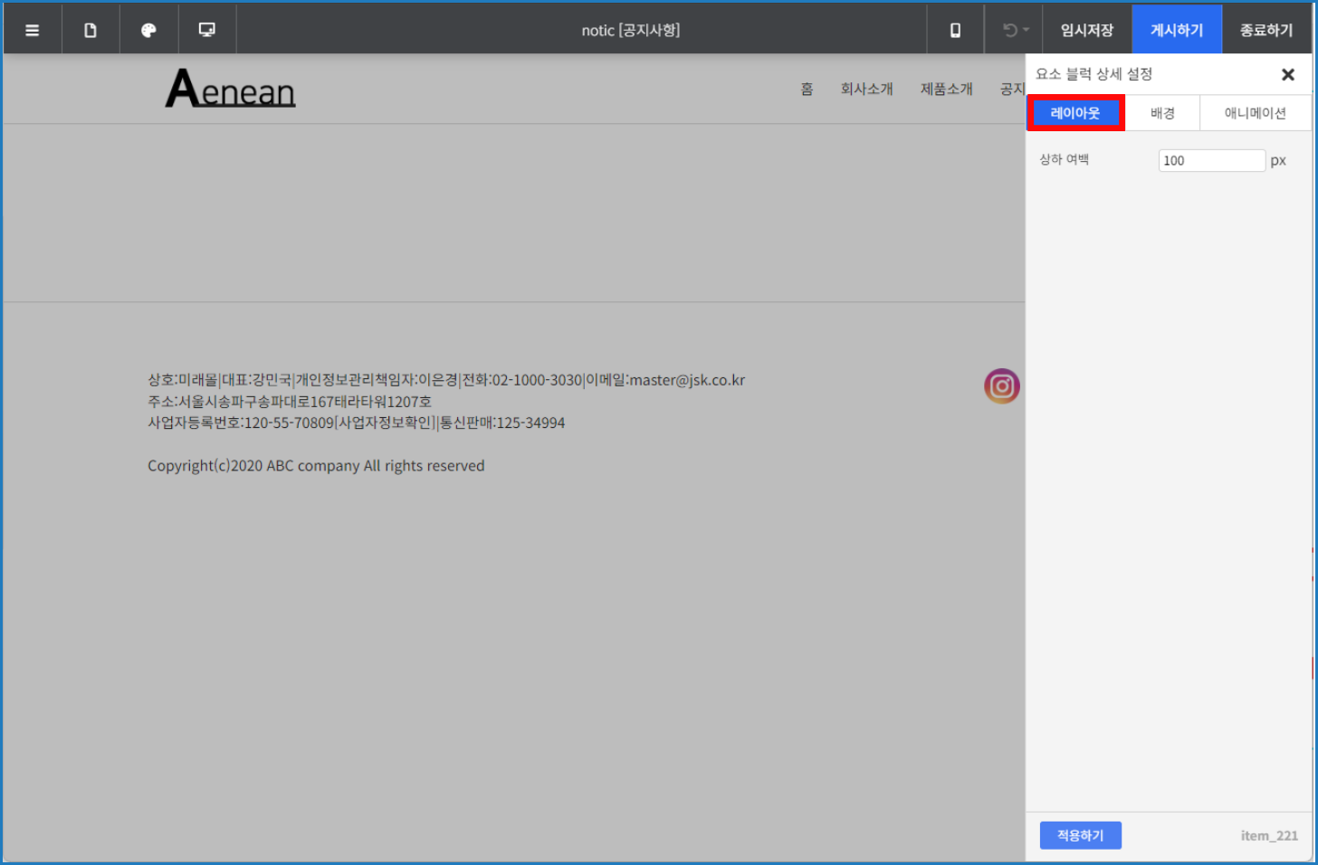 여백 블럭의 상세 설정창은 레이아웃, 배경, 애니메이션 세 개의 탭메뉴로 구성되어 있습니다.