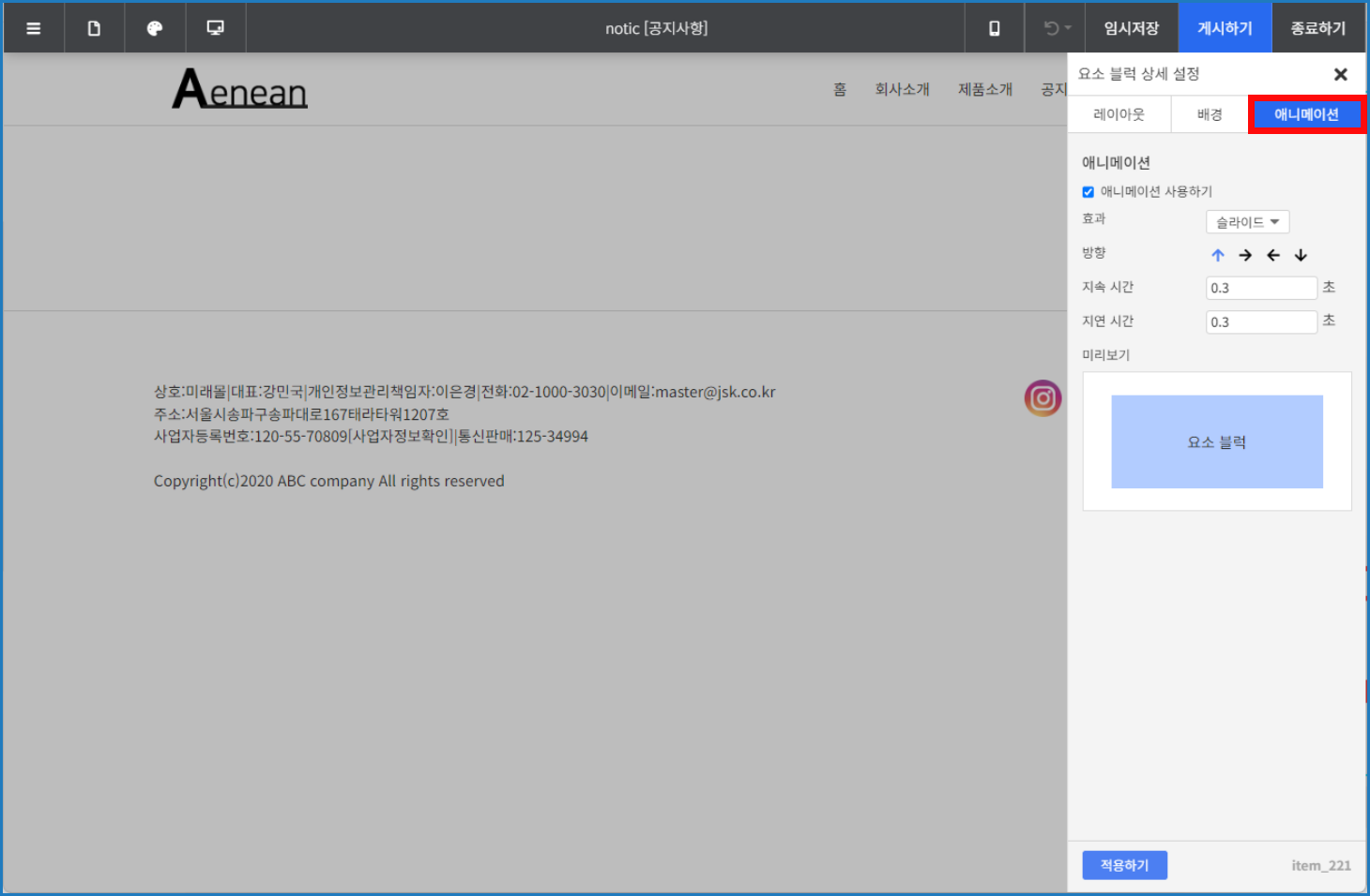 요소 블럭이 위치한 영역이 화면에 표시되고 몇 초 뒤에 애니메이션이 동작할 지 설정합니다. |