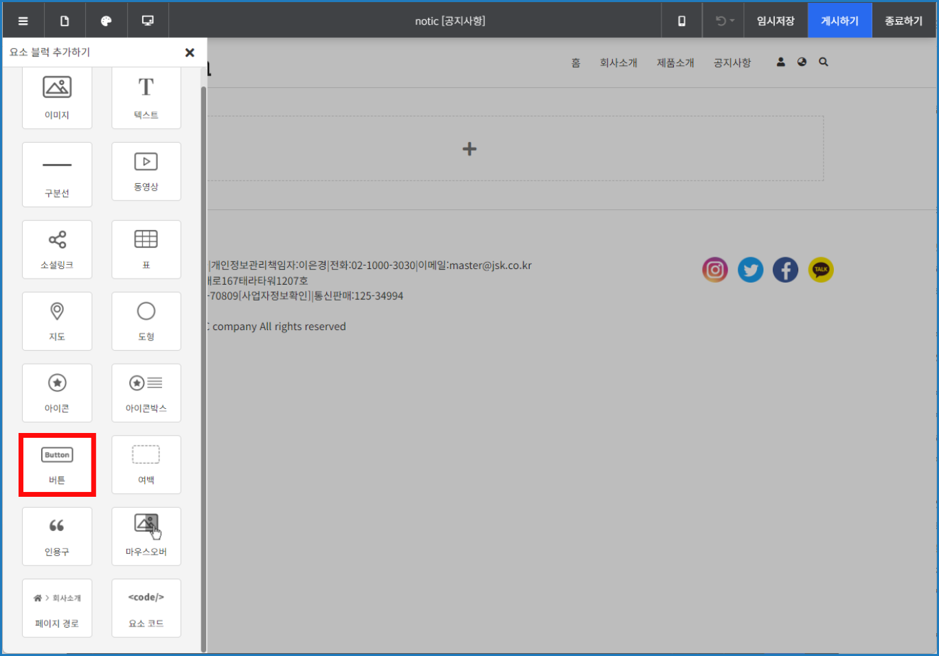 [요소블럭 추가] - [버튼] 으로 추가가 가능합니다.