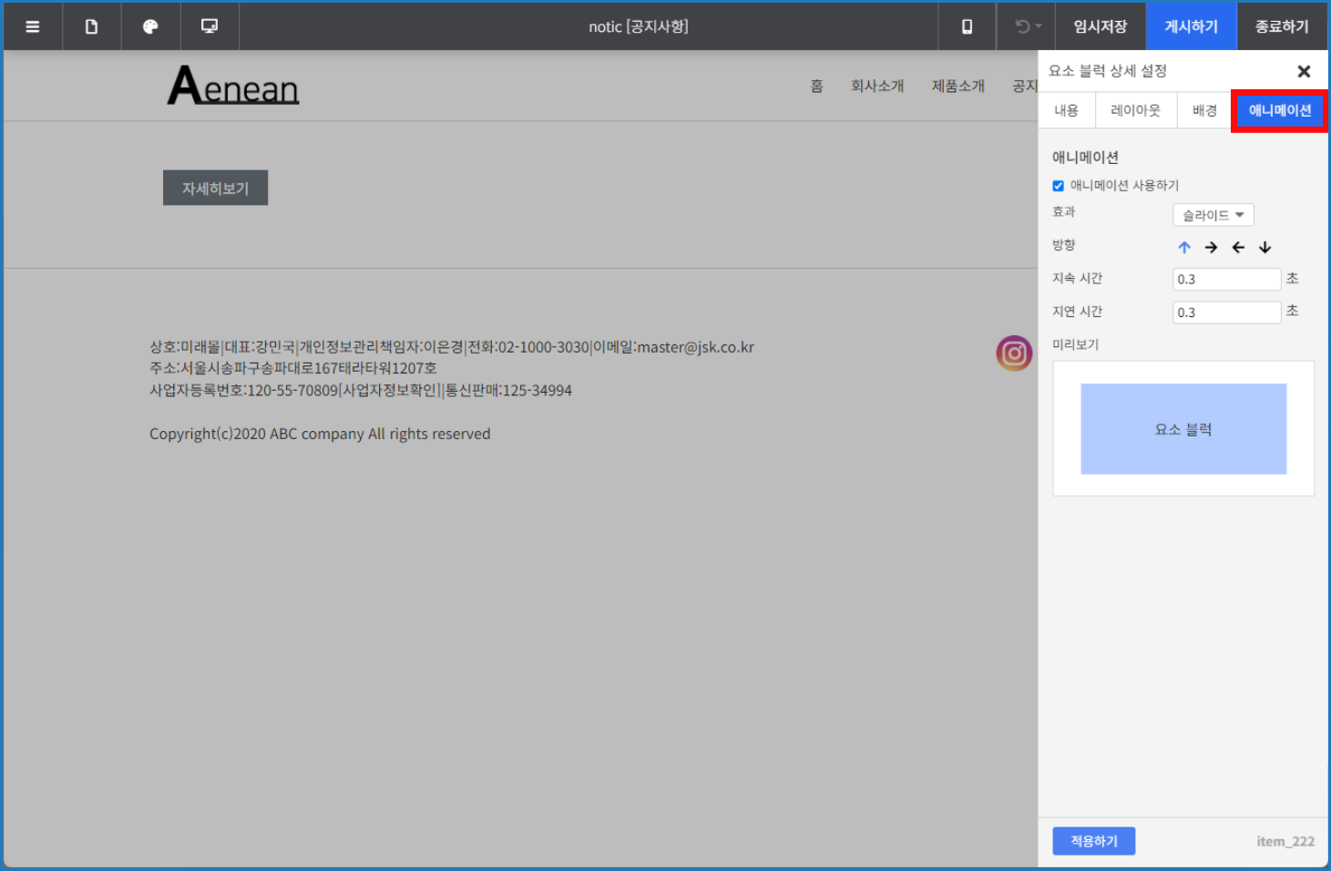 | 지연 시간 | 요소 블럭이 위치한 영역이 화면에 표시되고 몇 초 뒤에 애니메이션이 동작할 지 설정합니다. |