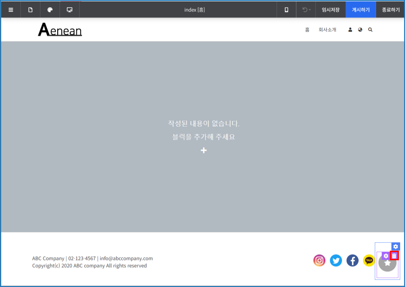 [디자인 편집] - 우측 하단의 퀵버튼의 [휴지통] 버튼 또는