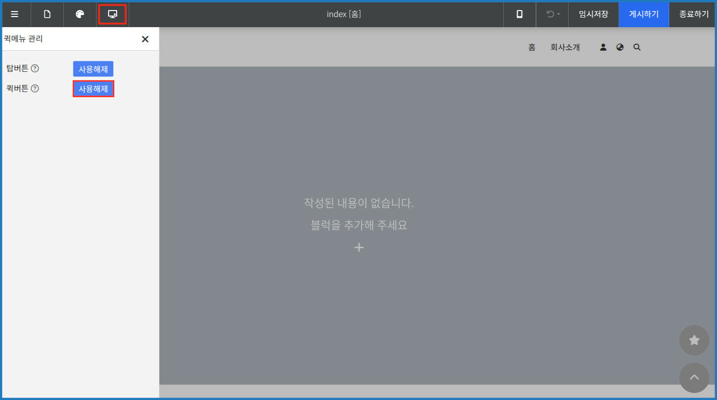 [디자인 편집] - [퀵메뉴 관리] - 퀵버튼의 [사용해제] 버튼을 이용해서 비활성화 할 수 있습니다.