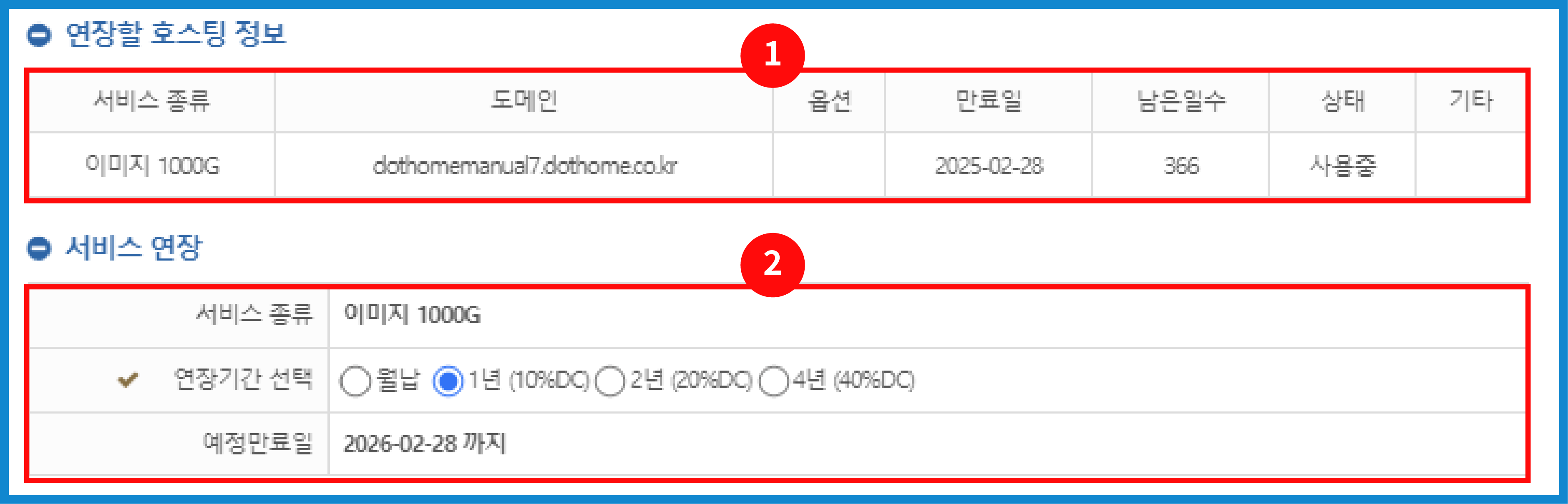 연장기산 선택 항목에서 원하시는 기간을 설정해주시면 되며, 1년 이상 연장시 장기 할인이 적용됩니다.
