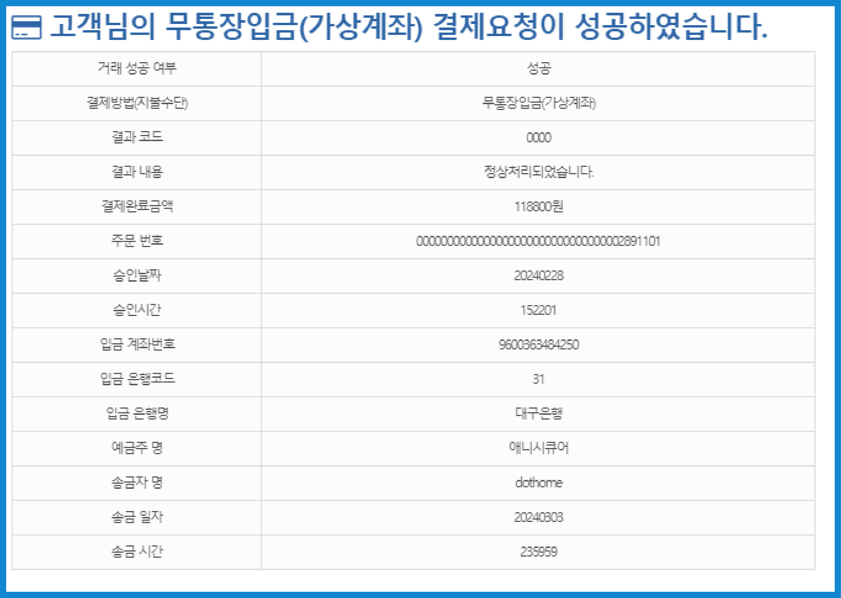 | 무통장 입금(가상 계좌) | 안내된 가상 계좌에 입금하는 방법입니다. |