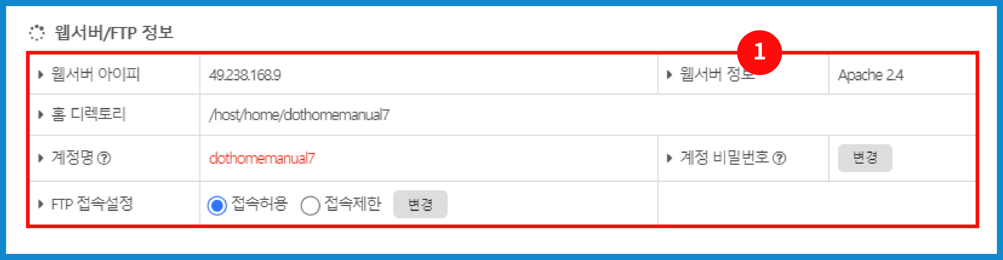 | 계정 비밀번호 | FTP 접속할때 사용하는 암호를 변경할 수 있습니다. |