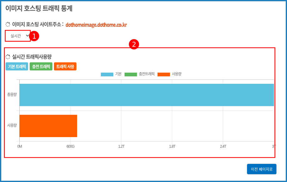 ③ 트래픽 사용량 확인이 완료되면 ③이전 페이지로 클릭하여 이미지호스팅 관리 페이지로 이동합니다.