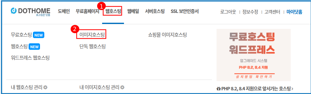 닷홈에 로그인하신 후 상단 메뉴 중 ①[웹호스팅]-②[이미지호스팅] 을 클릭합니다.