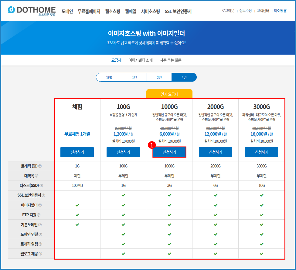 사양 비교 후 적합한 서비스의 [신청하기] 버튼을 눌러주세요.