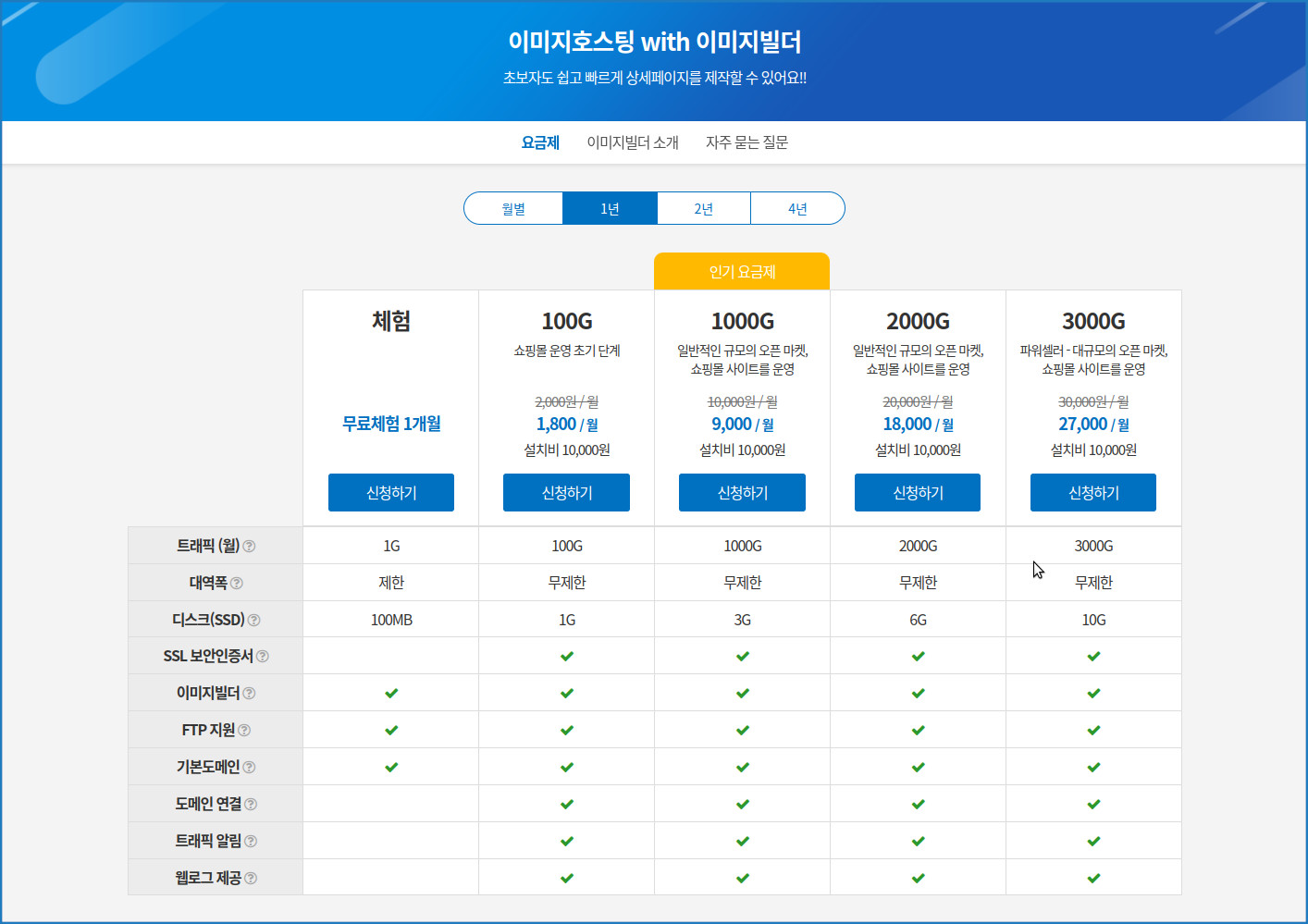 초기 단계인 100G 상품부터 규모가 있는 3000G 상품까지 운영중인 쇼핑몰이나 홈페이지에 적합한 서비스를 선택할 수 있습니다.
