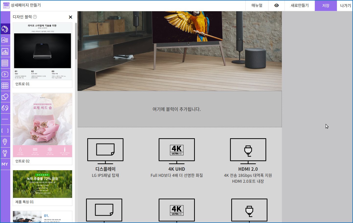 별도의 코딩 기술이나 그래픽 편집 기술이 없어도 다양한 디자인과 요소들을 블럭 쌓듯이 조립해서 쉽게 상세페이지를 제작할 수 있습니다.