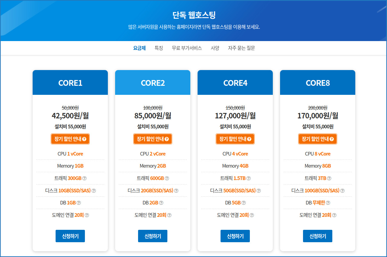 닷홈 단독 웹호스팅은 CORE1, CORE2, CORE4, CORE8 4가지 상품으로 구성되어 있습니다.