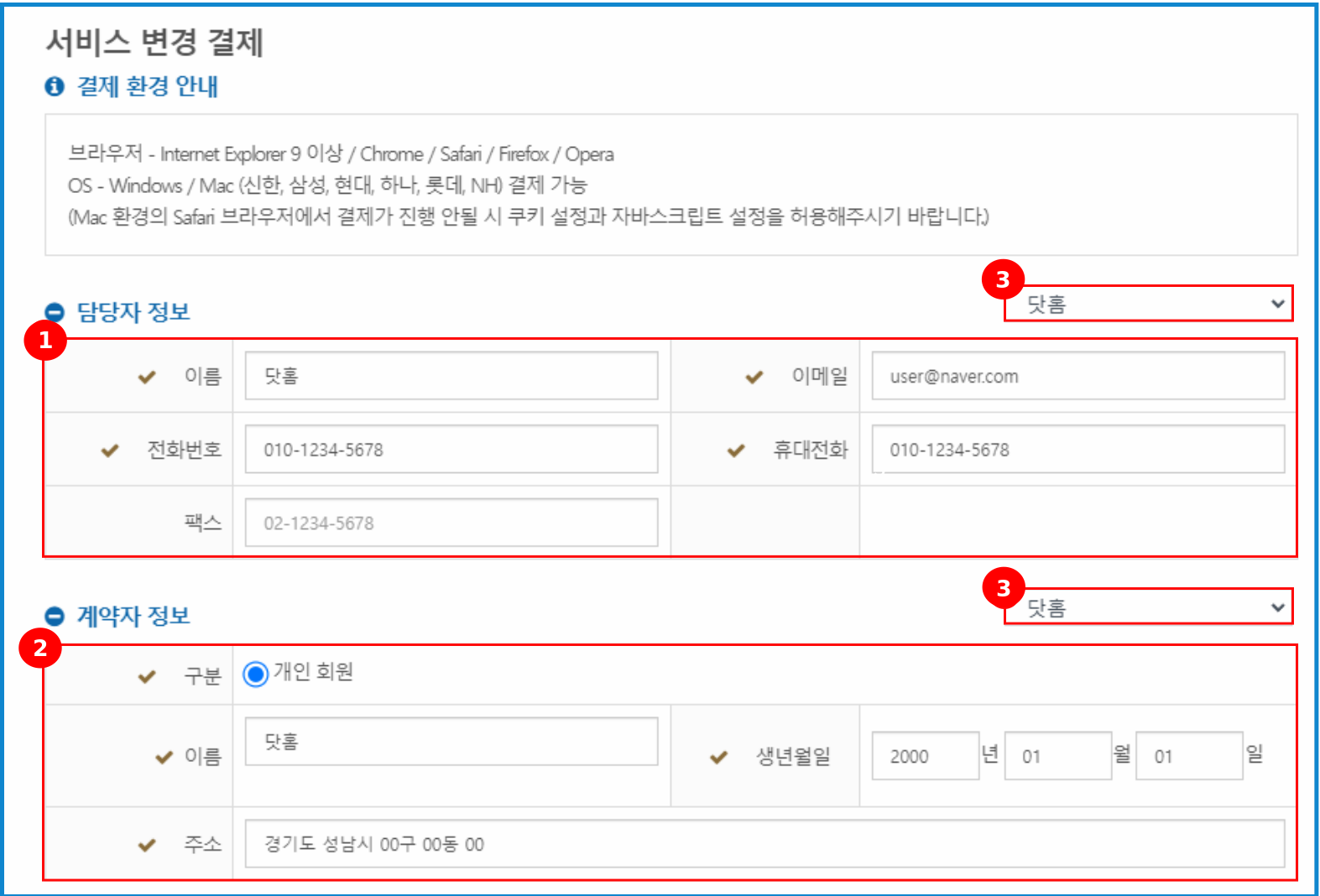 아래 글을 참고하여 담당자, 계약자 정보를 입력해 주세요.