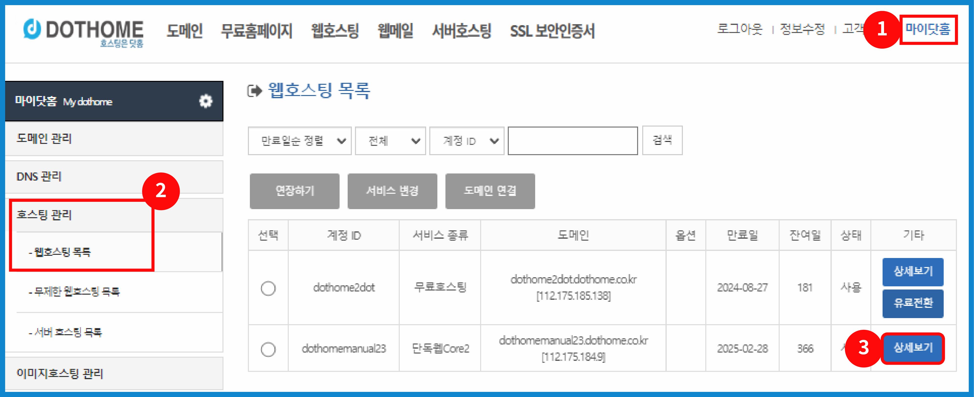 닷홈 홈페이지에 로그인하신 뒤 ① [마이닷홈]-②[호스팅 관리]-[웹 호스팅목록] 에서 변경하려는 서비스의 ③[상세보기] 버튼을 눌러주세요.