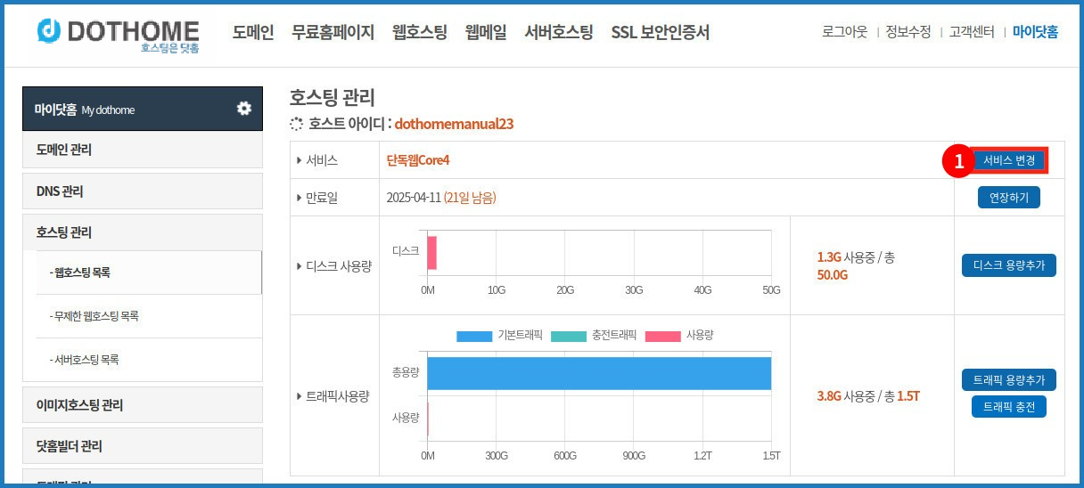 [마이닷홈] - [웹호스팅 관리] - [웹호스팅 목록] - [상세보기] - [서비스 변경] 페이지에서 변경하실 수 있습니다.