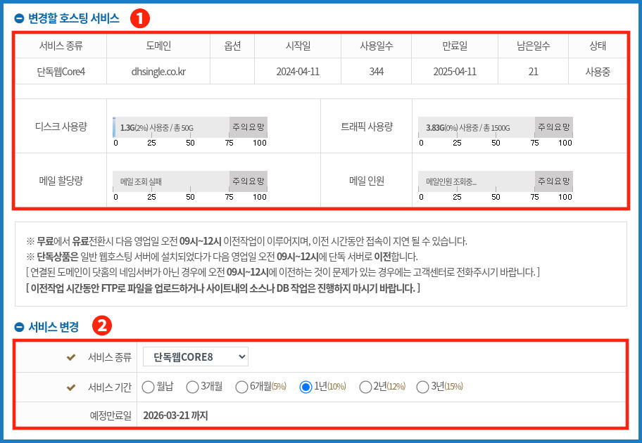 [단독 웹호스팅 변경할 서비스 정보 화면]