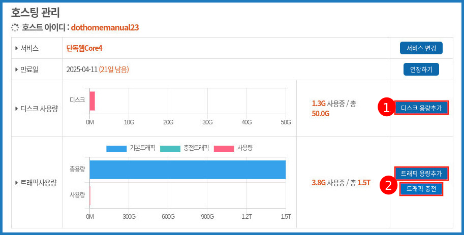 호스팅 상세보기 페이지에서 상단 "디스크 사용량" 또는 "트래픽 사용량" 항목 우측 끝에 ①[디스크 용량 추가] 또는 ②[트래픽 용량 추가] [트래픽 충전] 버튼을 이용하여 추가 페이지로 접속하시거나,