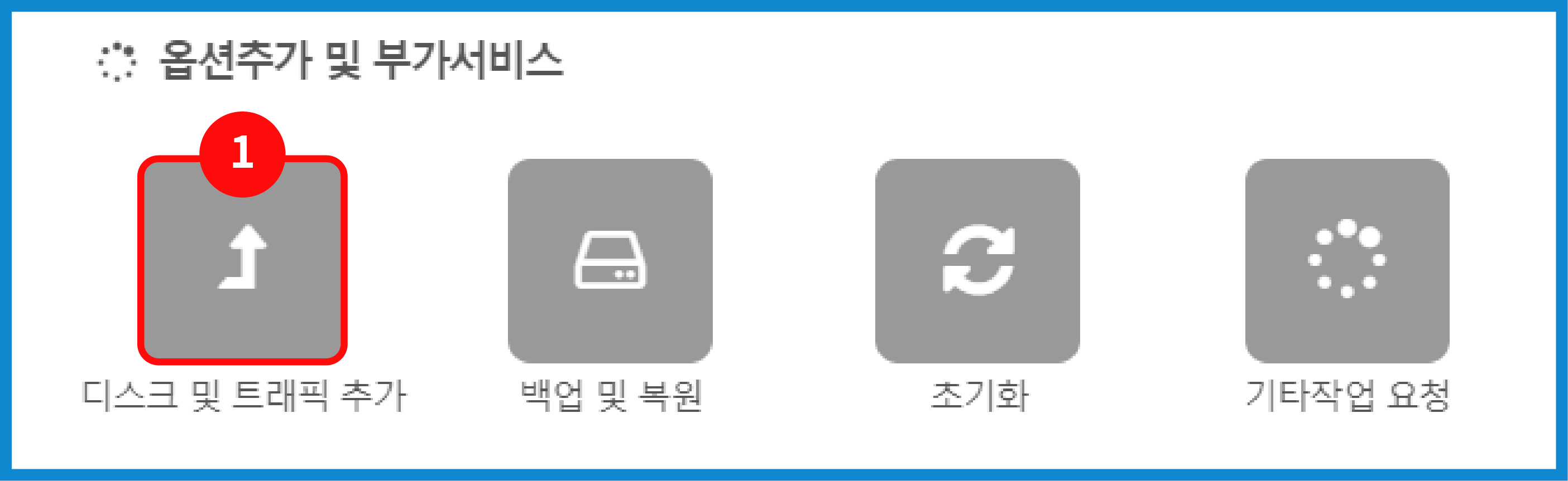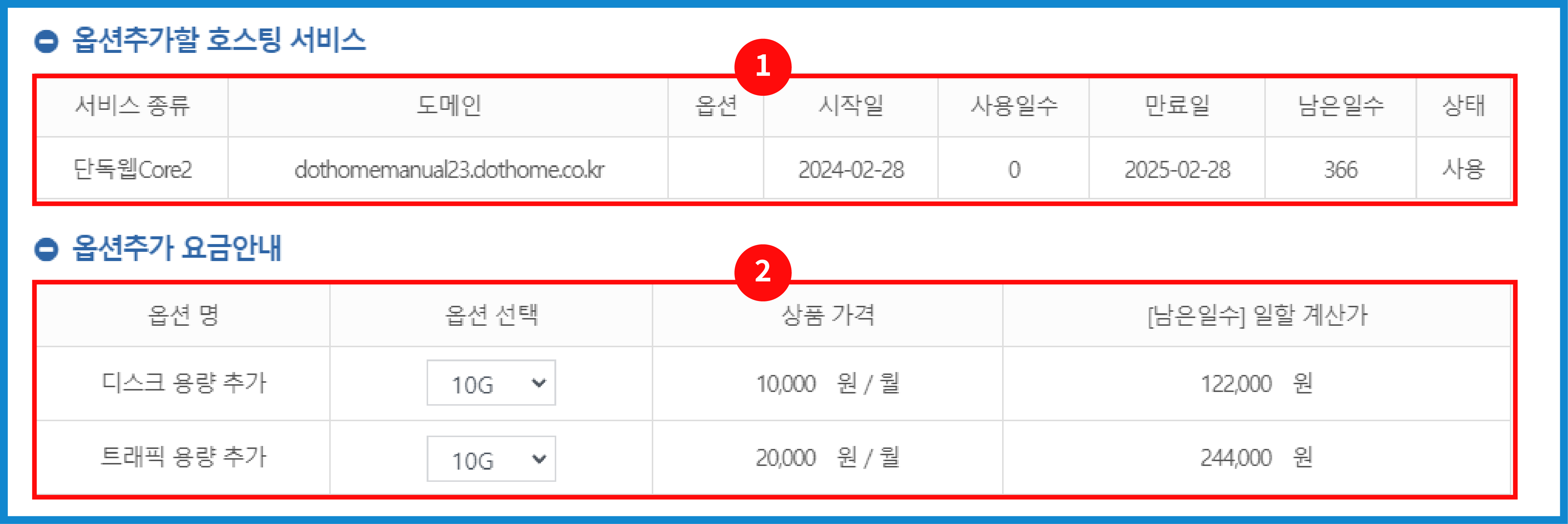 단독 웹호스팅 서비스에 디스크나 트래픽만 추가가 필요한 경우 해당 옵션만 추가할 수도 있습니다.