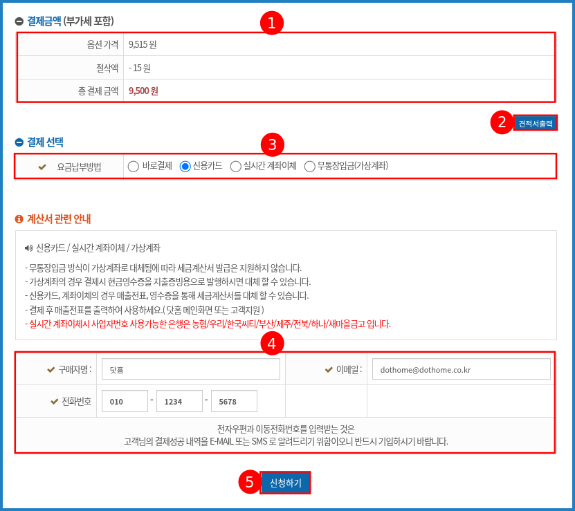 정보 입력을 마쳤다면 ⑤ [신청하기]버튼을 눌러줍니다.