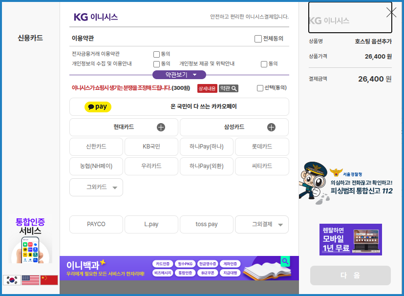 신용카드 결제 시 나오는 결제창으로 본인이 편한 결제 방법을 결정 후 결제를 진행해 주세요.