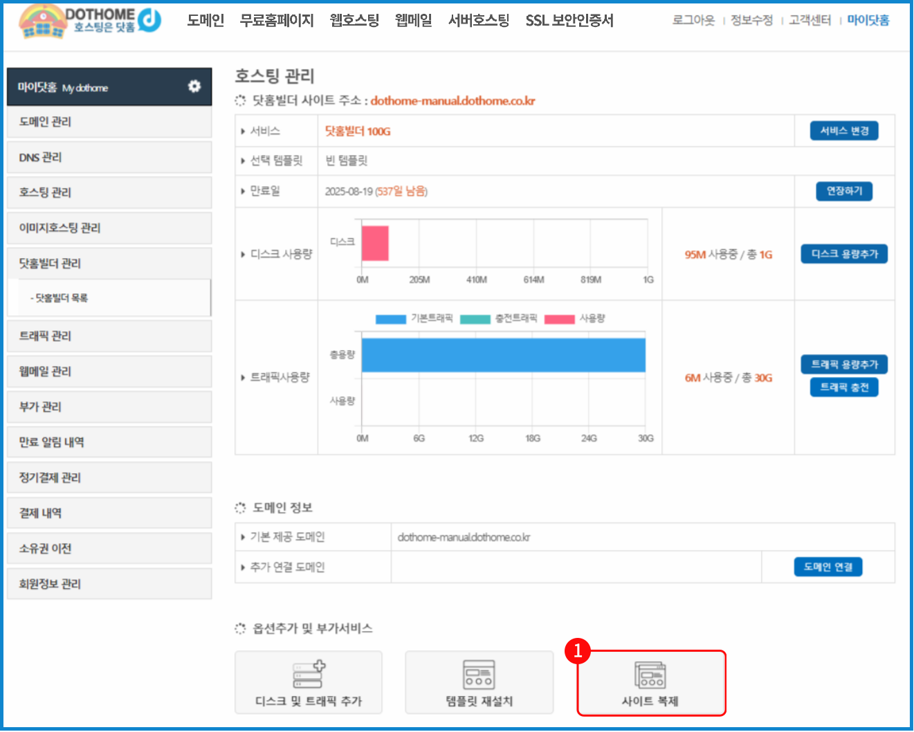 | 기본 제공 도메인 | 닷홈에서 기본으로 제공하는 도메인 주소를 확인하실 수 있습니다. |