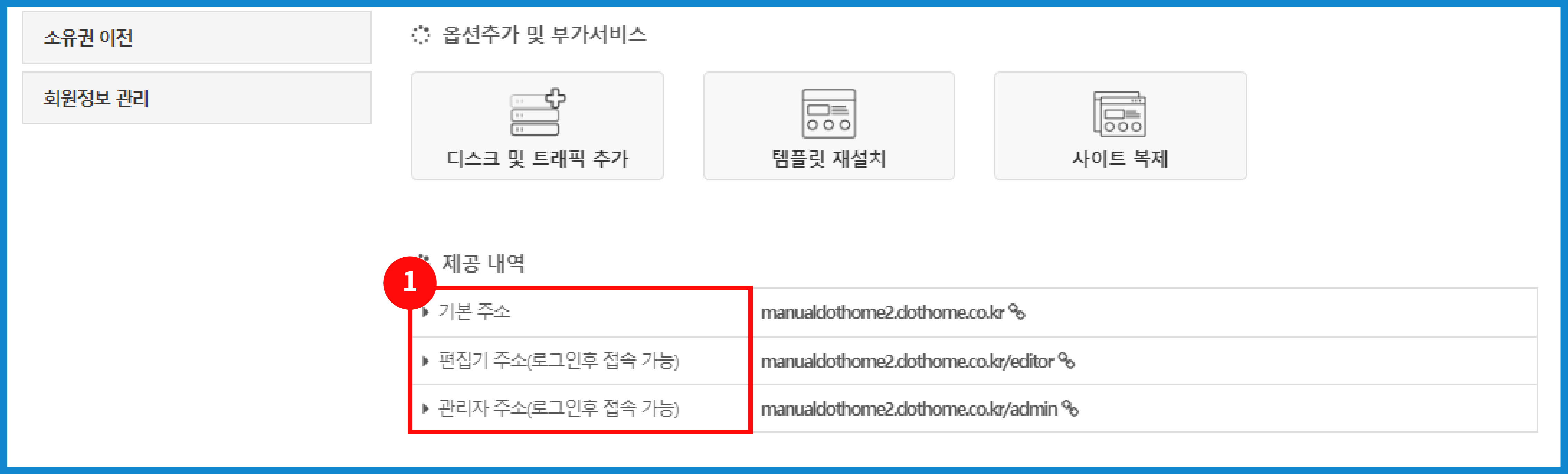 빌더 정보, 도메인 정보, 옵션추가 및 부가 서비스, 제공내역 등을 확인하실 수 있습니다.