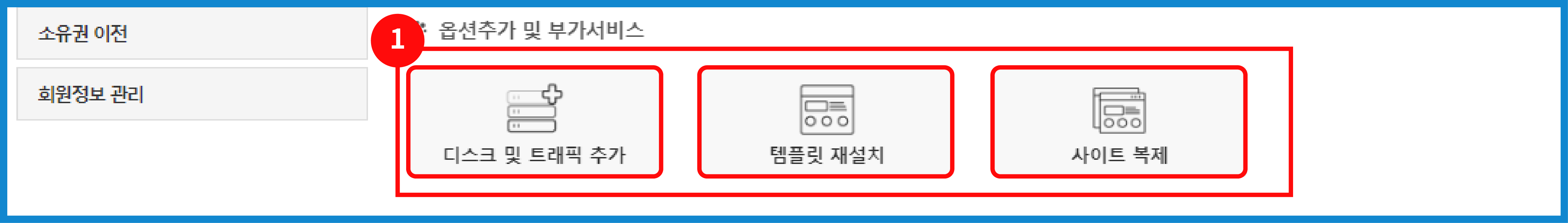 상세보기 페이지에서 "옵션추가 및 부가서비스" 항목의 ①[사이트 복제] 버튼을 눌러주세요.