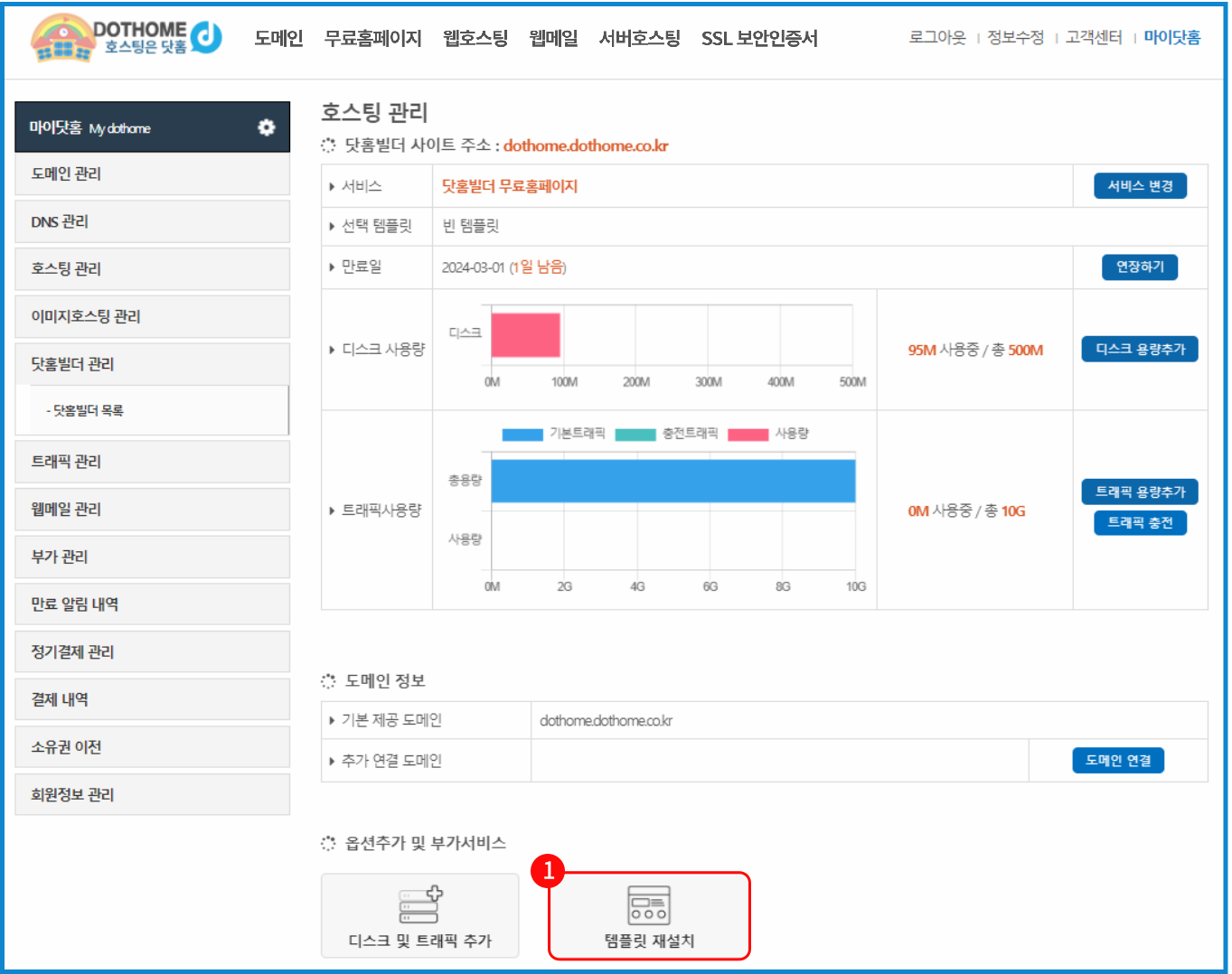 | 기본 제공 도메인 | 닷홈에서 기본으로 제공하는 도메인 주소를 확인하실 수 있습니다. |