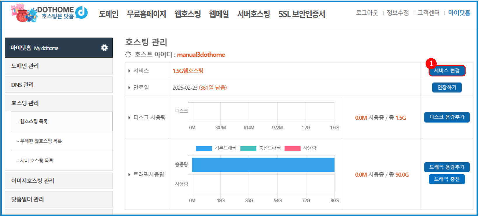 충전된 트래픽은 [마이닷홈] - [호스팅 관리] - [웹호스팅 목록] - [상세보기]로 이동하여 확인하실 수 있습니다.