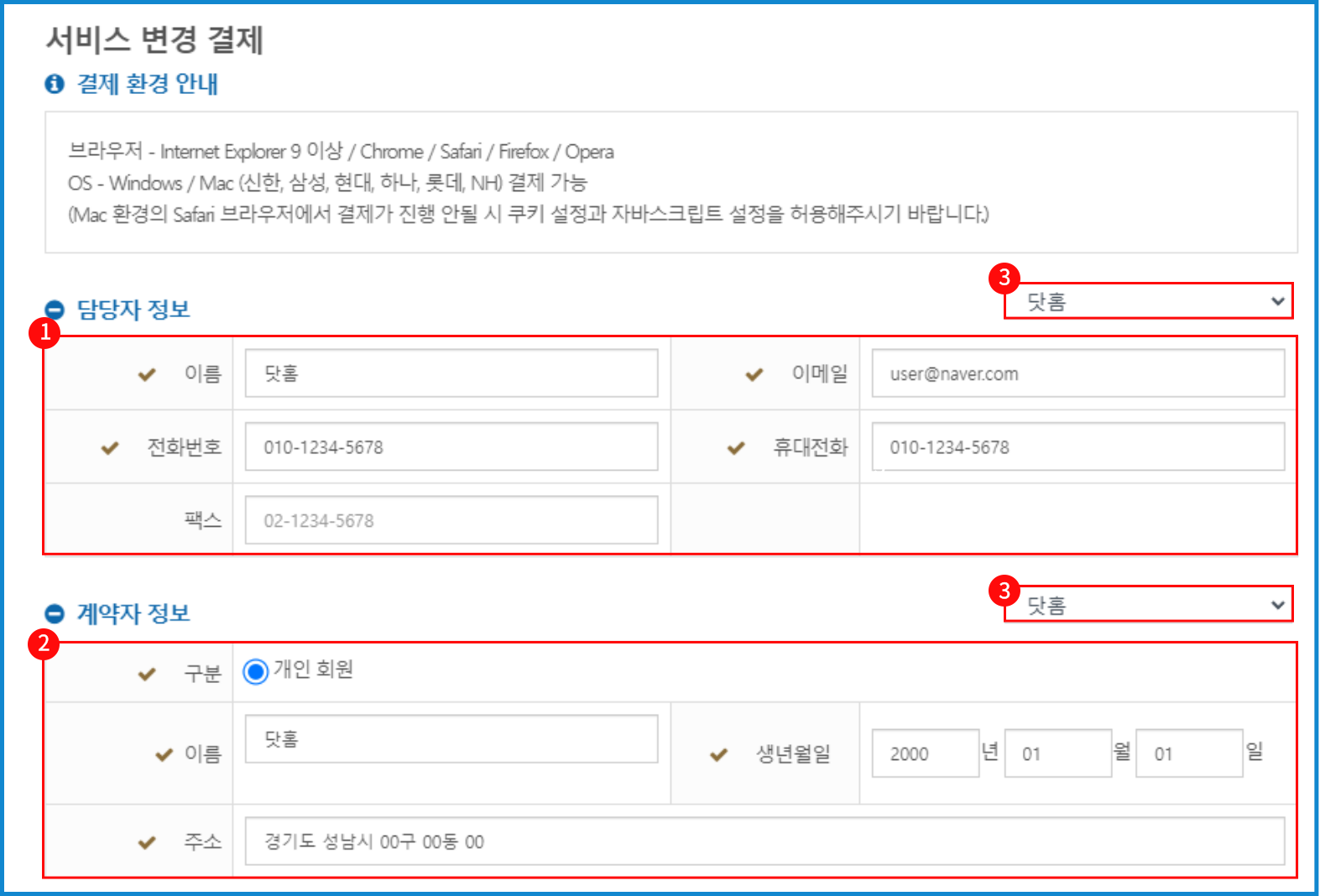 [웹호스팅 서비스변경시 담당자, 계약자 정보 입력 화면]