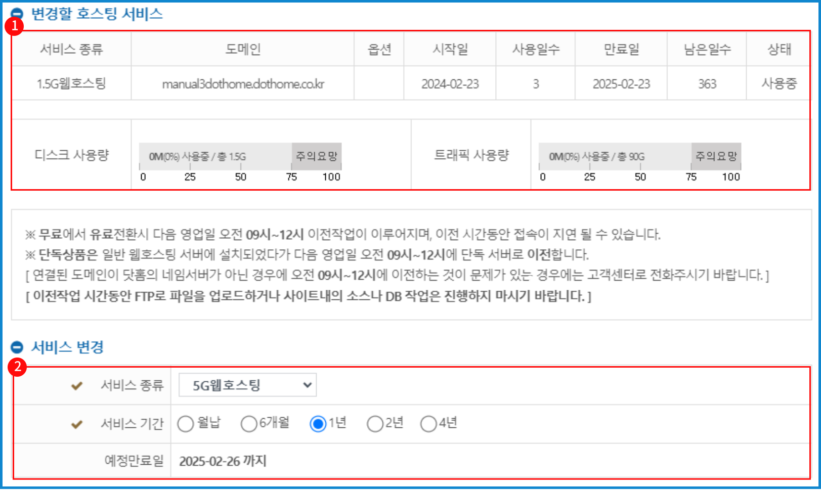 서비스가 전환되어도 기존에 작업한 홈페이지는 그대로 유지되며 트래픽, 디스크만 업그레이드 됩니다.