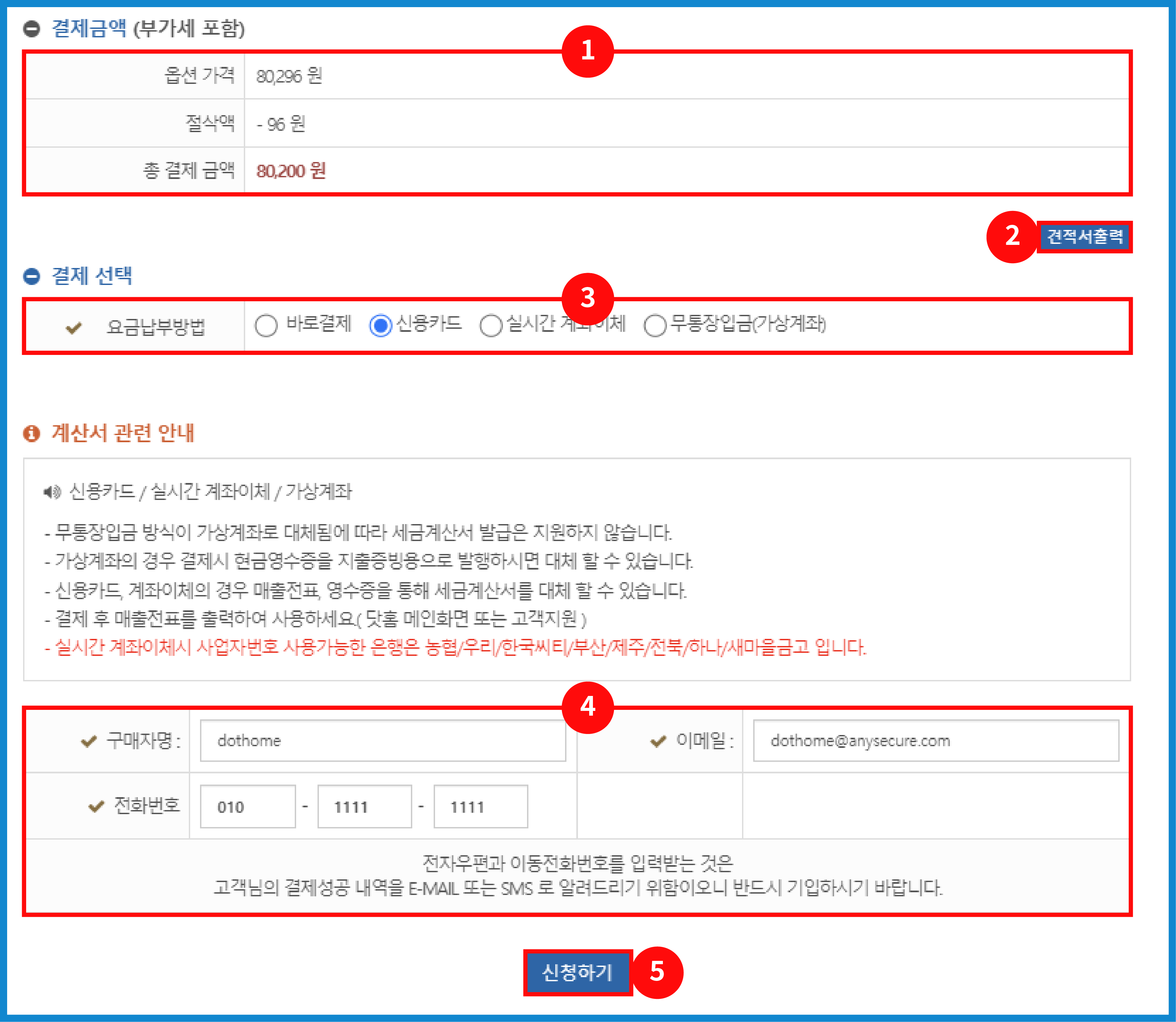 아래 표를 참고하여 결제 수단 결정 및 결제자 정보를 작성하고 ⑤[신청하기] 버튼을 눌러주세요.